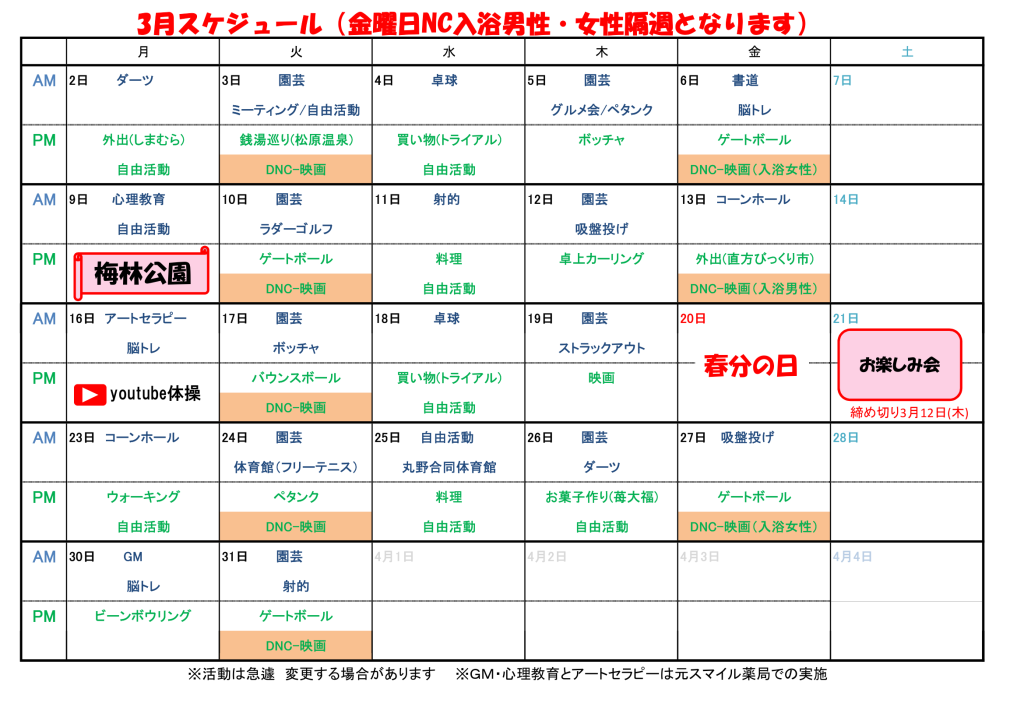一般コースの3月予定表ができましたので、お知らせします。