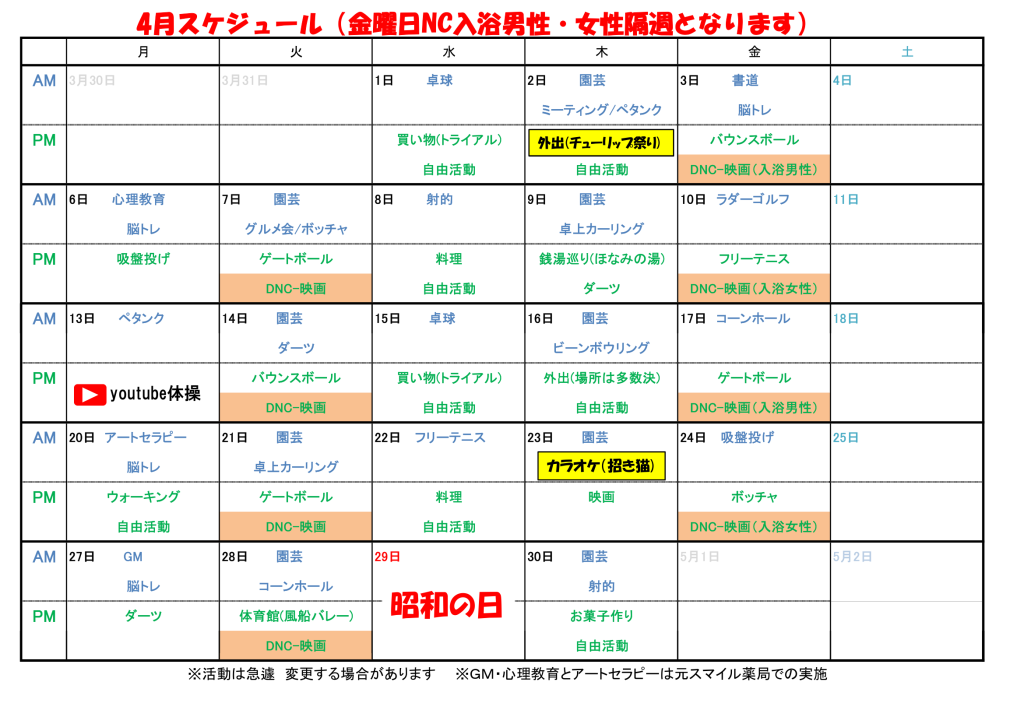 プログラムの内容や実施時間については、下記の予定表をご確認ください。体調やご都合に合わせて、無理のない範囲でご参加いただければと思います。