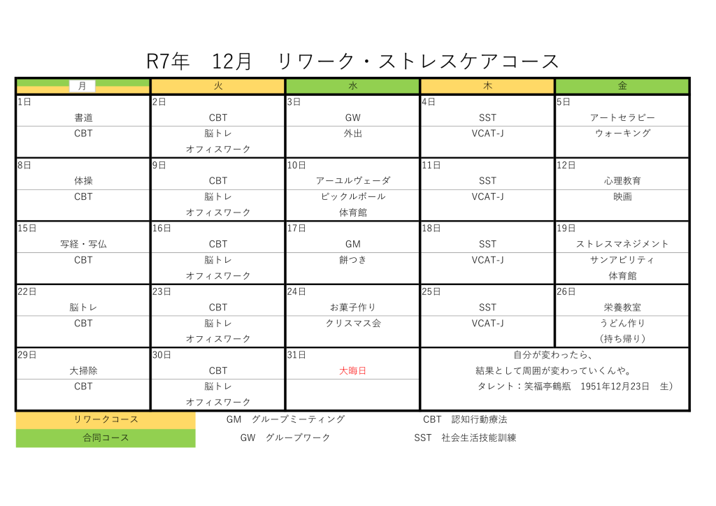 ストレスケアコースの12月予定表ができましたので、お知らせします。